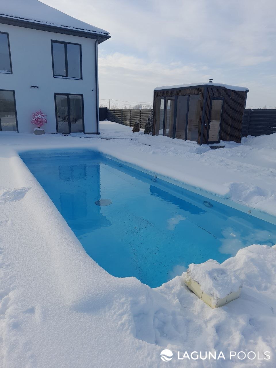 Прямоугольный бассейн с голубой водой в окружении снежных сугробов рядом со светлым двухэтажным домом и деревянной постройкой с панорамным остеклением.